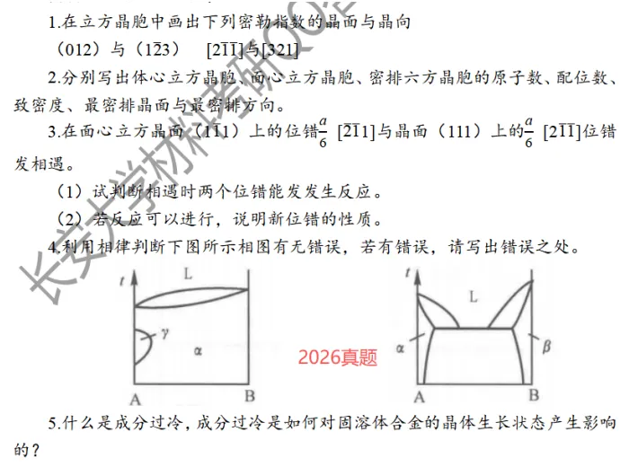 今年的题型主要是10道名词解释、10道简答题、2道分析论述题。其中名词解释是比较简单的。但是简答题出现了很多新题型,例如第4题相图判断正误、第6题临界晶核计算问题等,将近30分的内容是不容易得到的,尤其出现了三元相图的简单计算(不过在2025年也考了,在今年就属于简单性题目啦)等。分析论述题的第一道铁碳相图属于常规性题目,但是第二道关于滑移系的习题是从来没有出现在历年真题里面的,难度比较大。