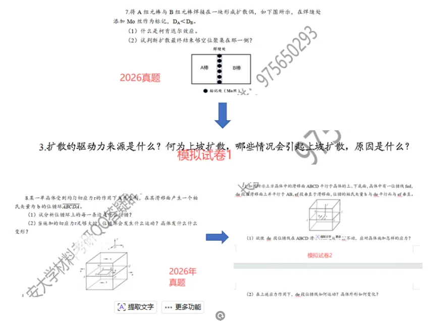 首先大家可以看一下咱们今年滴简答题,第1、2、3题其实是常规性题目,除了第3题的第二问比较难一些(不过在课上师兄也是讲了很多次啦,简单的位错相关问题),其他应该说是很简单滴。第4题相图判断有一定难度,需要大家利用吉布斯相律。其中第5/8/9/10题在咱们的模拟卷都有出现过嗷!另外26的宝子要注意了嗷,计算和三元相图题型将会是以后几年命题的新方向!
