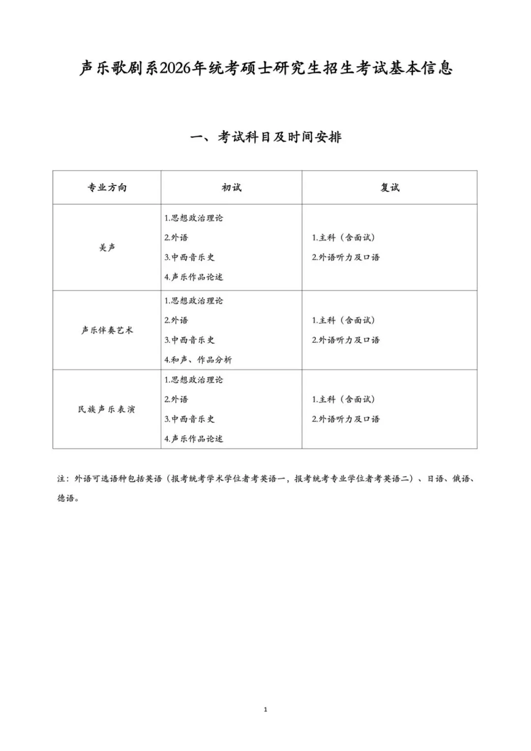 声乐歌剧系2026年统考硕士研究生招生考试基本信息