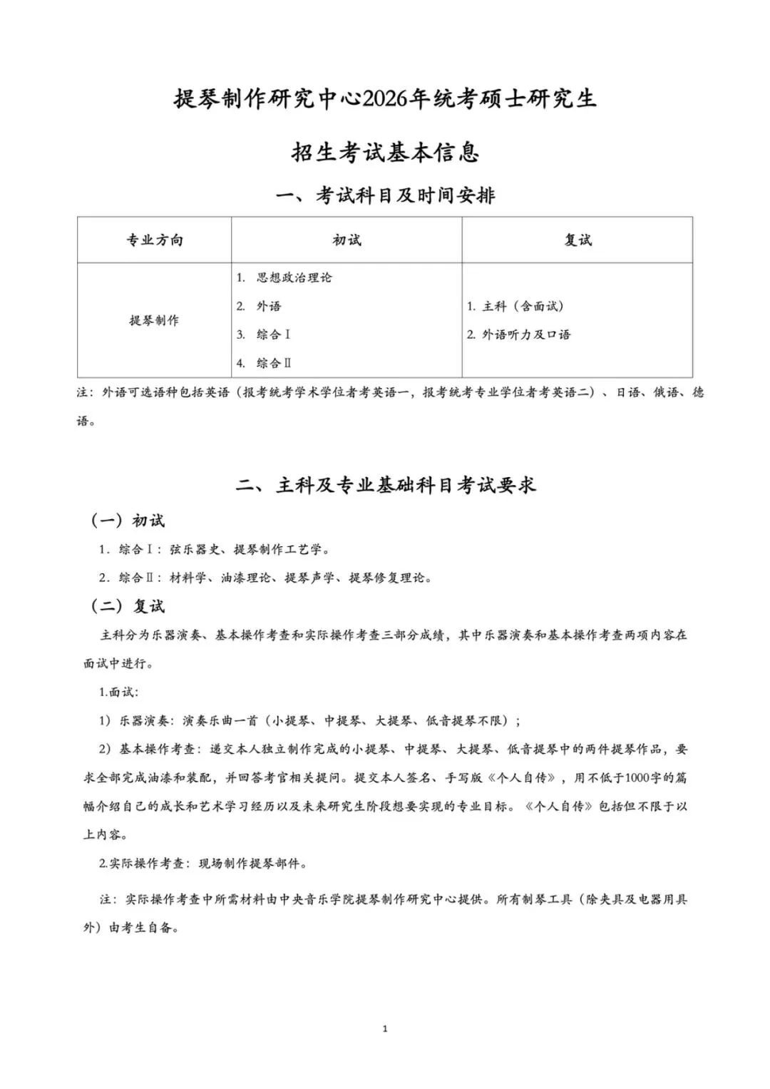 提琴制作研究中心2026年统考硕士研究生招生考试基本信息
