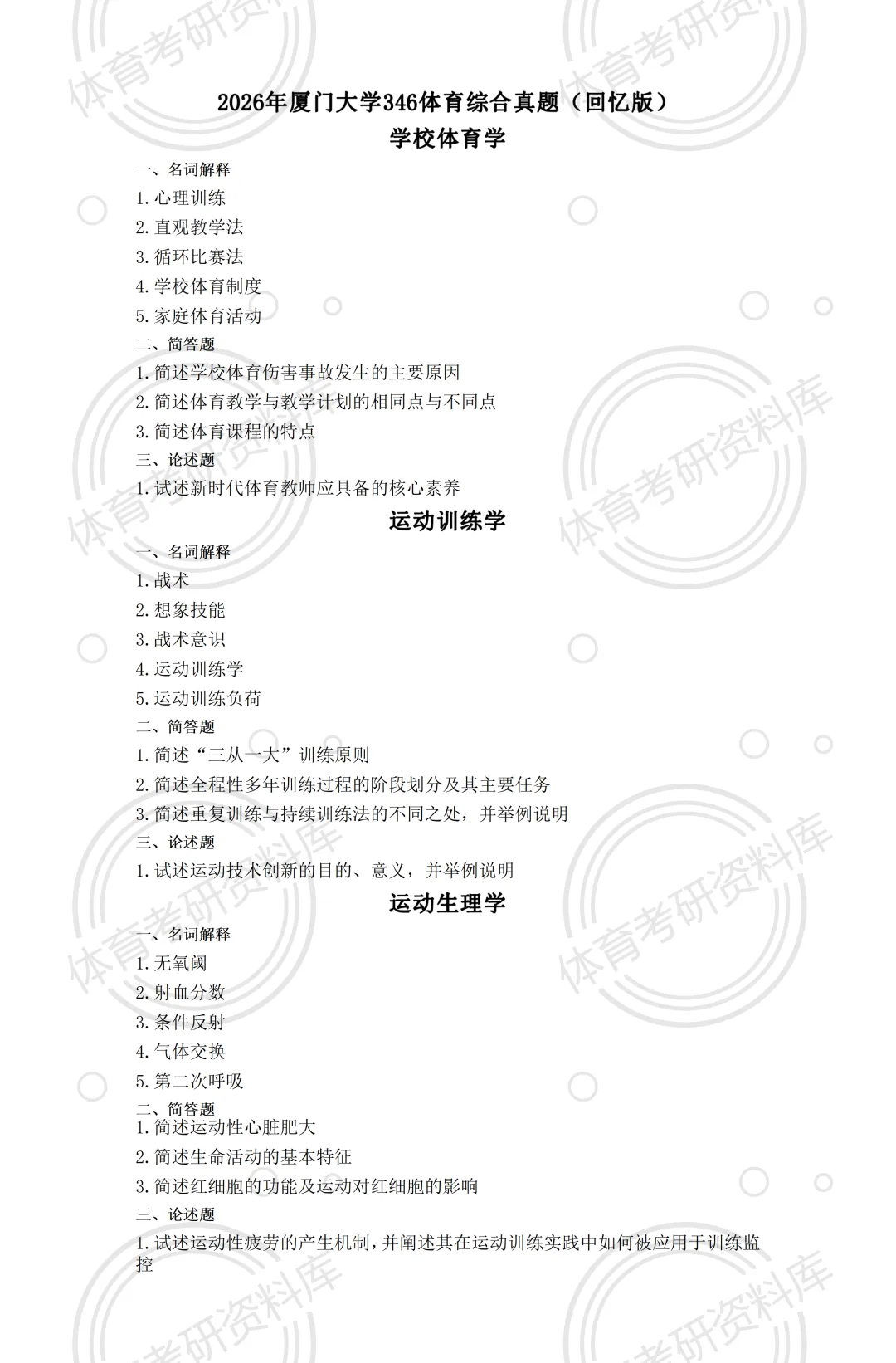 今天给大家分享的是厦门大学346体育专硕考研真题考研真题(回忆版)仅供大家学习交流使用