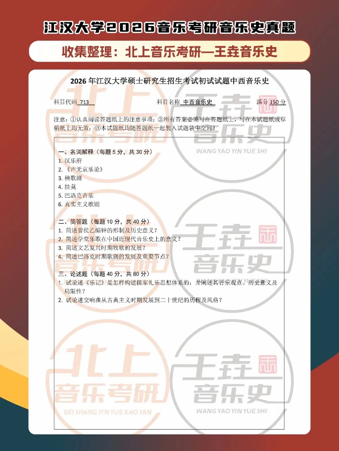 >江汉大学2026音乐考研音乐史真题|北上音乐考研-王垚音乐史工作室收集整理
