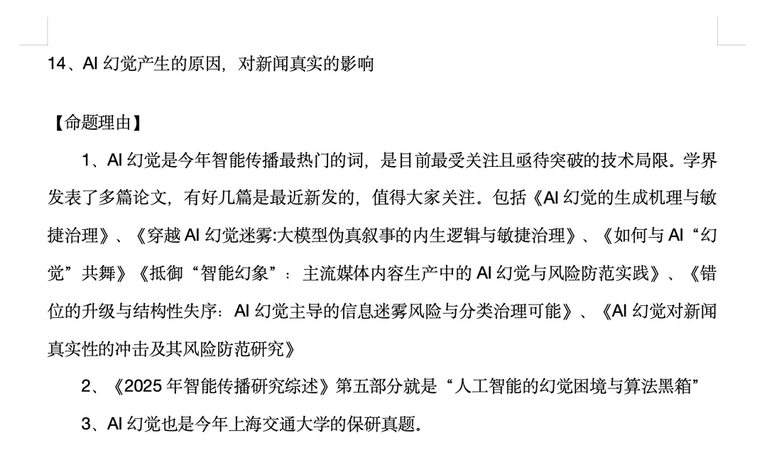 1、AI幻觉是2025年智能传播最重要的热点,我们在西交模拟考中出了“AI幻觉的生成机理和治理路径”,和本题是差不多的的,生成机理就是生成机制。但需要注意的是,真题问的更加细致,提到了认知风险。那么就必须紧扣认知回答。