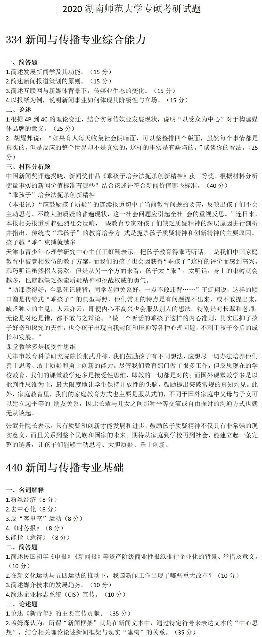 湖南师范大学新闻与传播考研真题2020