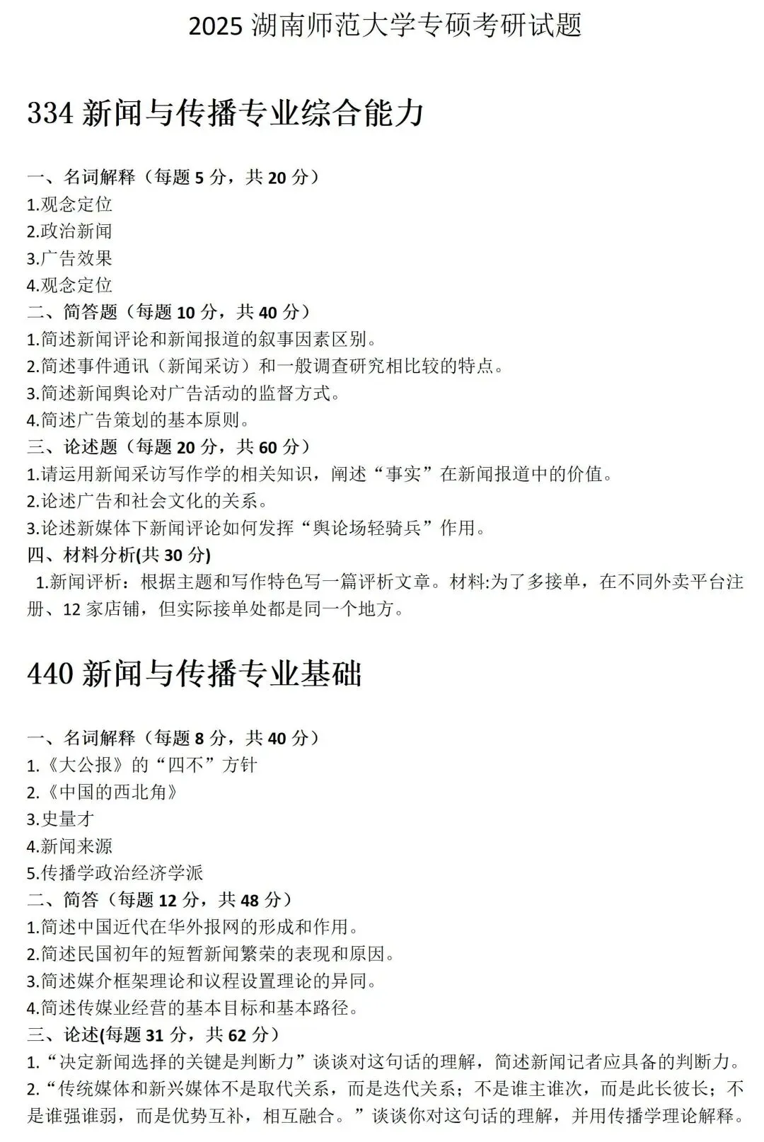 湖南师范大学新闻与传播考研真题2011-2025历年