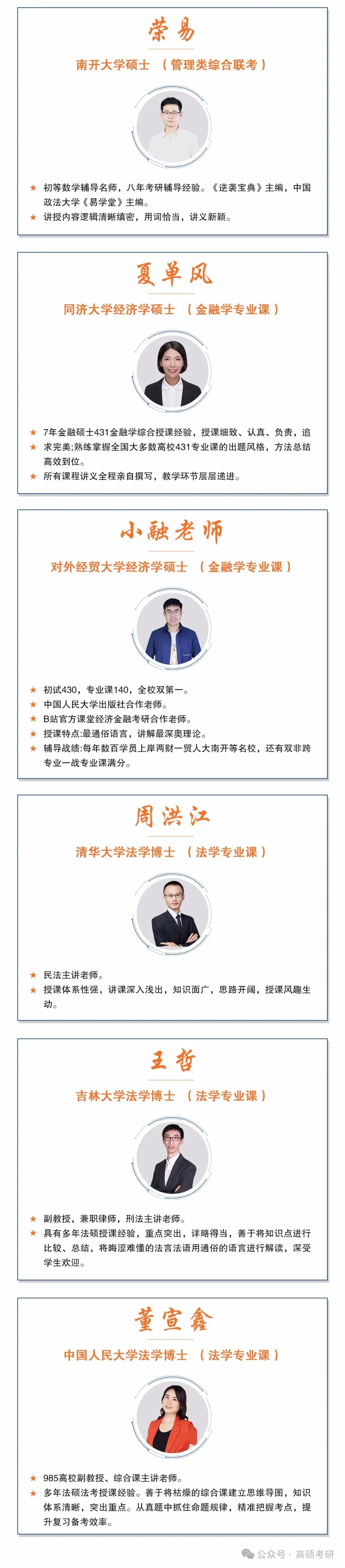统考专业课由国家教育部考试中心出题,常考科目有199管理类联考、396经济类联考、教育学311、333教育学基础、408计算机学科专业基础、397/398、497/498法律硕士基础与综合等,高硕请到了各板块的一线师资,采用线上和线下相结合的方式,帮助同学们顺利通过专业课考试,以下是对于师资方面的介绍。