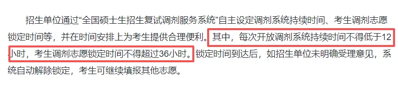 原则上,调剂系统每次开放至少12小时,给大家充分的时间填报;填报后,志愿锁定时间最长不超过36小时。