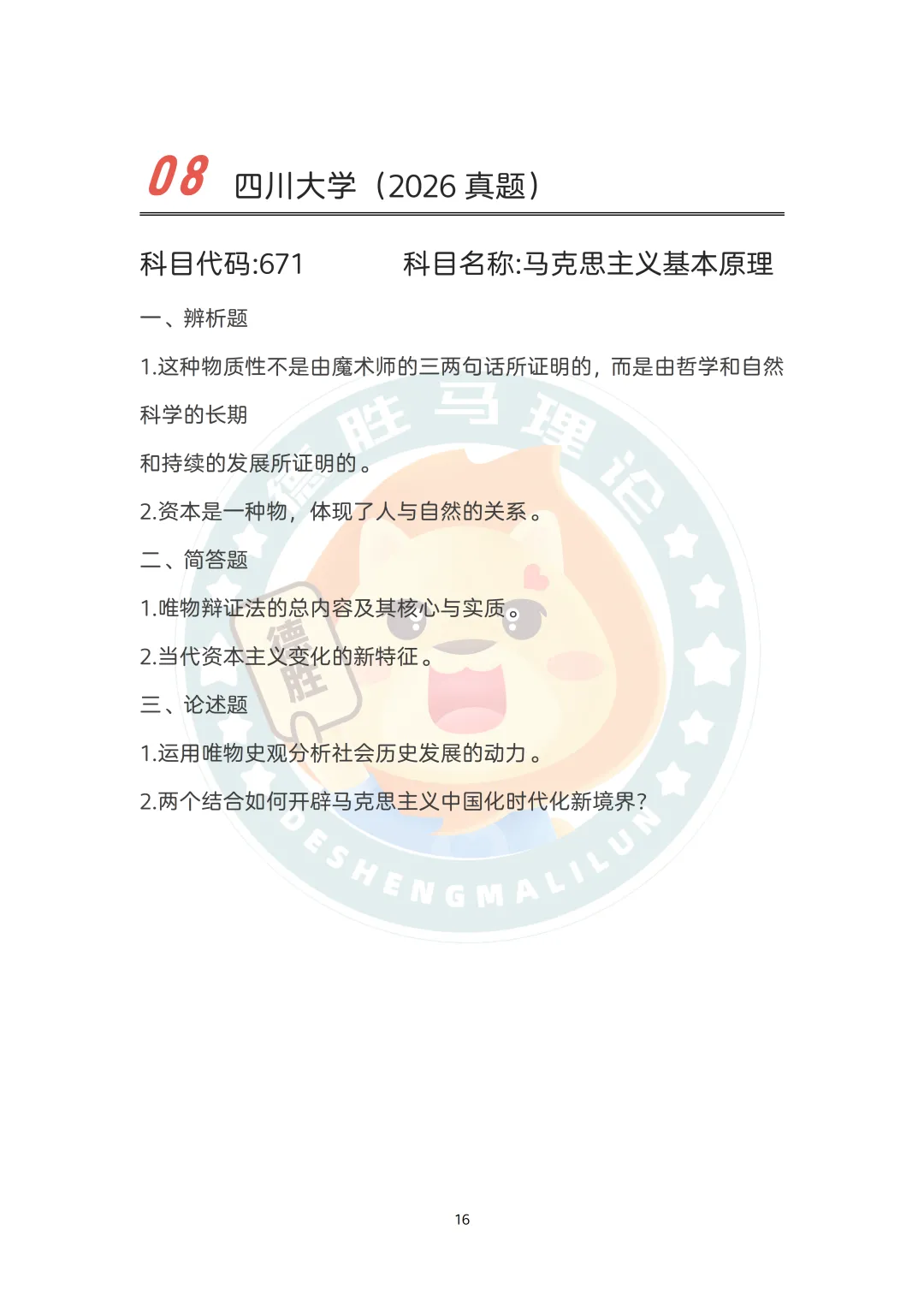 作为西南地区马理论研究的学术重镇,川大今年的命题风格思辨性强、注重原著、突出学术深度。671科目(马克思主义基本原理)以辨析题引领,直指理论核心与常见误解;819科目(马克思主义发展史)题目设计精巧,要求对经典论断、历史分期与理论论证有精准把握。这充分体现了川大对考生理论辨析能力、原著理解深度和学术视野的高要求。