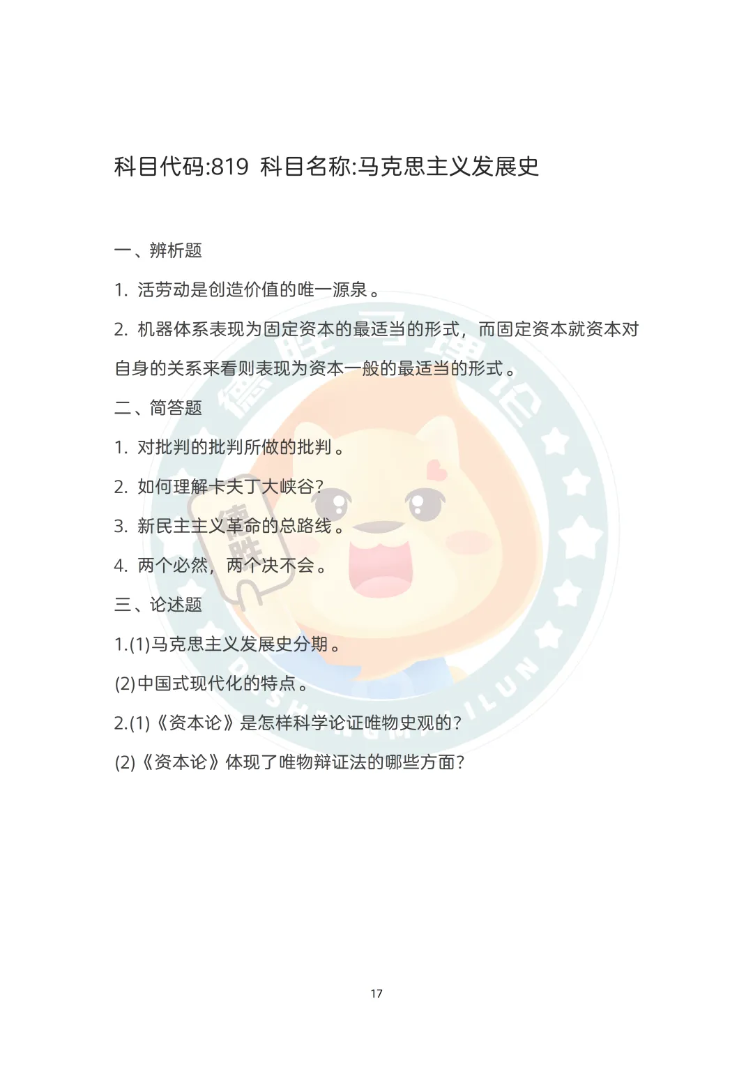 819科目要求熟悉马克思主义发展史上的经典著作、重要论断及其背景,具备一定的文本解读能力。
