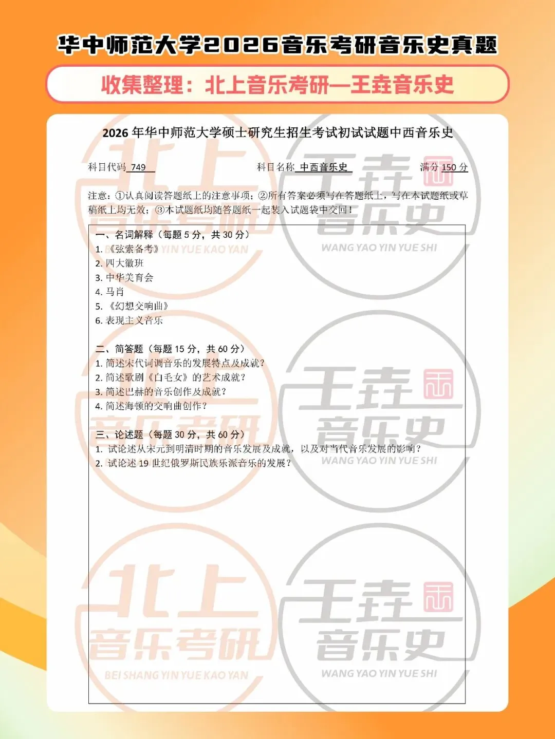 华中师范大学2026音乐考研音乐史真题|北上音乐考研-王垚音乐史工作室收集整理