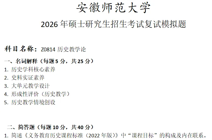>安徽师范大学Z0814历史教学论考研复试真题模拟