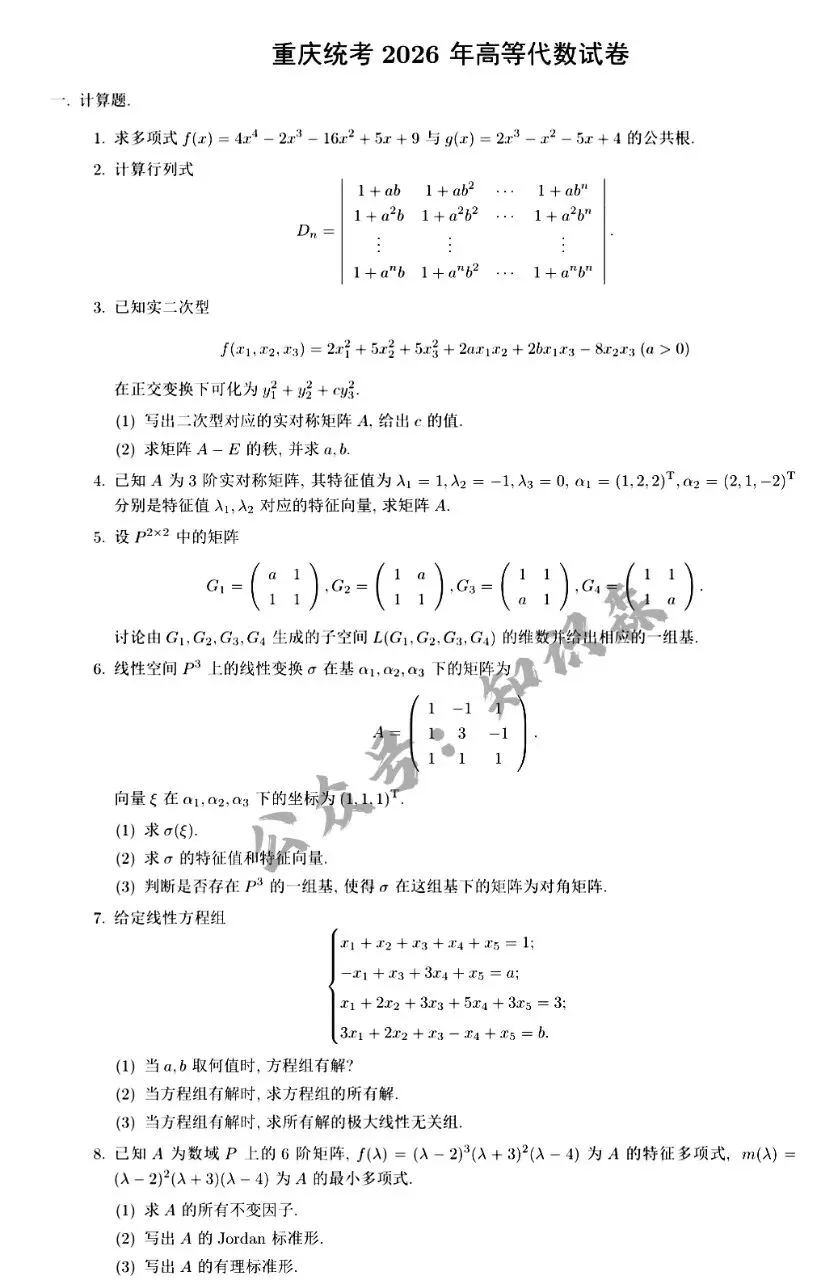 >重庆市统考2026高等代数考研真题