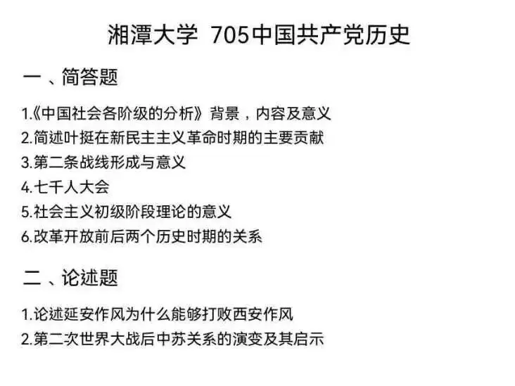 湘潭大学705中国共产党历史真题紧扣中共党史发展主线,呈现出“基础导向、史实聚焦、逻辑关联、现实观照”的鲜明特征。命题覆盖新民主主义革命时期、社会主义革命和建设时期、改革开放时期的关键节点,既注重对核心史实(人物、事件、会议、理论)的精准考察,又强调对历史逻辑、因果关联及现实启示的深度解读。简答题侧重“是什么、为什么”的基础梳理,论述题侧重“怎么看、有何启示”的深度剖析,整体凸显“以史为基、以论为要”的学科考察逻辑,贴合中国共产党历史专业的核心培养目标。