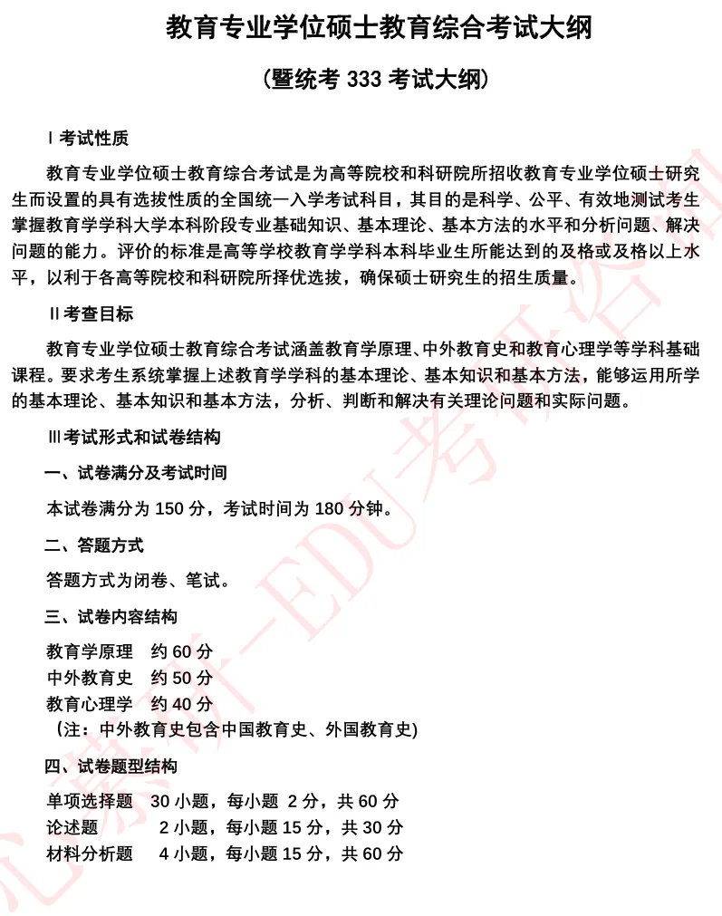 所以计划开始27年教育学专业硕士研究生考研的同学,在一开始复习专业课的时候,最好全面通览一下统考333的考试大纲,以便全面了解333的【考试形式】、【试卷结构】、【考查内容】、【考查知识点】等。