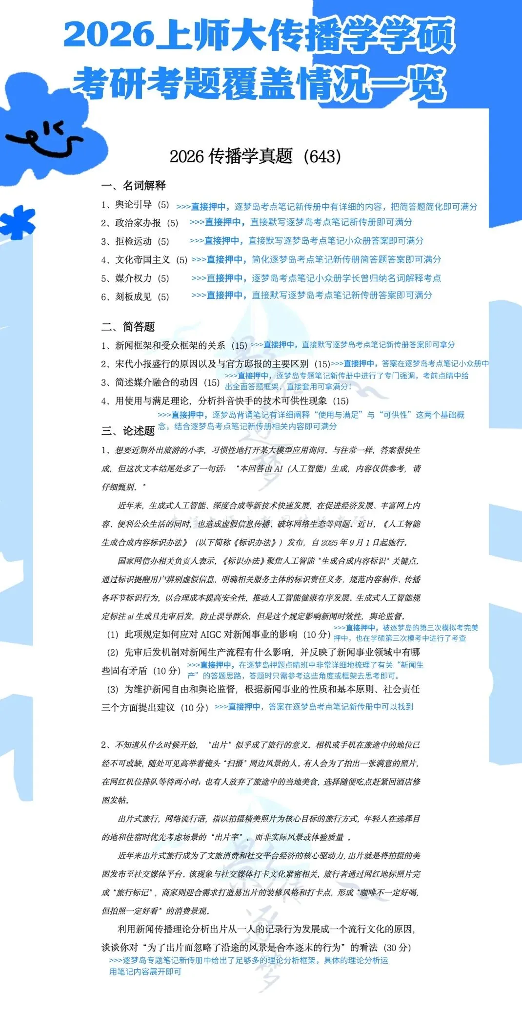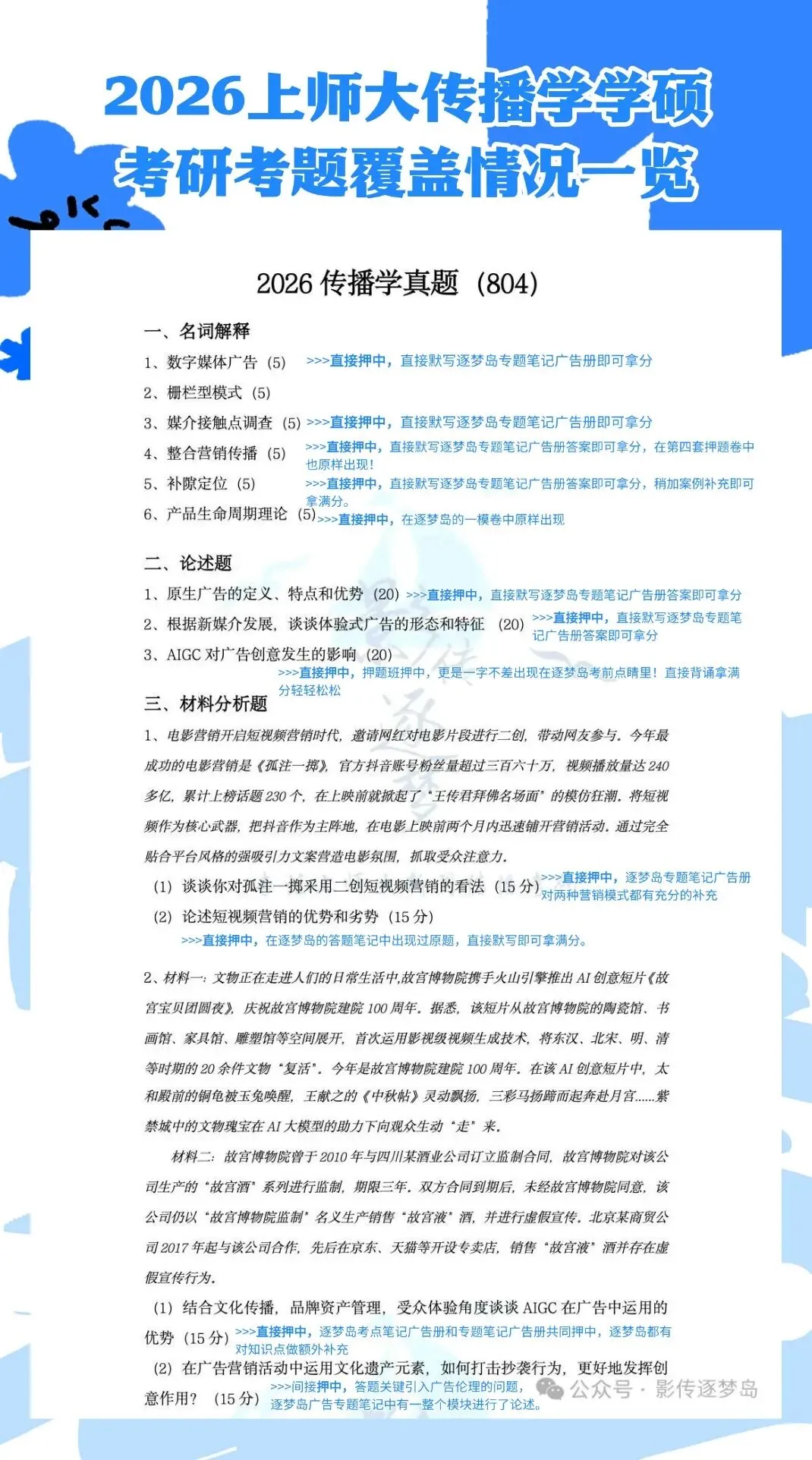 千呼万唤终于来了!今天学长来和大家唠唠2026的传播学真题!首先是大家最关注的押题情况!今年,逐梦岛覆盖了2026上师大新传学硕的全部300分考试内容,其中押题点睛覆盖到了50分考题!虽然今年的考题确实比较基础了,但其中了穿插了部分少见的案例以及需要转两个弯的难题。