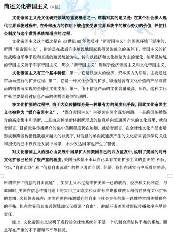 逐梦岛考点笔记新传册直接押中!“文化帝国主义”是《传播学教程》第十三章“国际传播与全球传播”中的基础考点,这个概念比较宏大,但本次考试只做名词解释考察,简化下笔记中的简答题答案即可拿满分,名词解释200字即可,无需面面俱到。