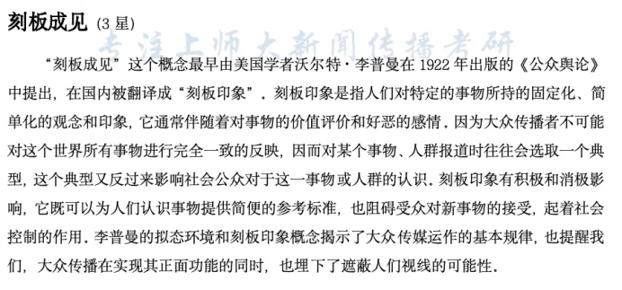 逐梦岛考点笔记新传册直接押中!“刻板成见”这个考点出现在《传播学教程》的第七章“大众传播”,书上虽然没有详细论述这个概念,但是学长在笔记当中做了充分的补充,直接默写即可拿满分。