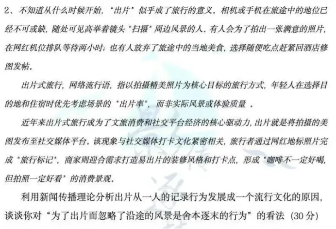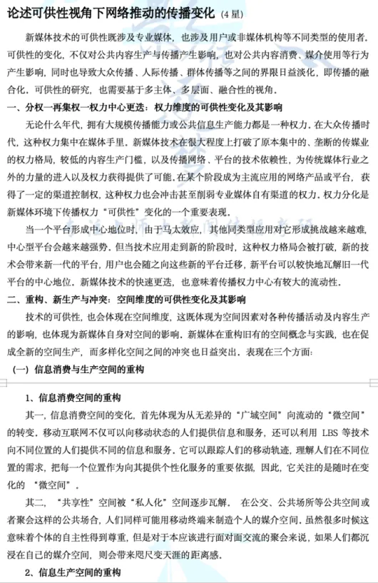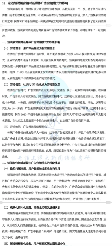 同时,题面亦可理解为“短视频平台通过自身的技术条件来引导、强化用户的使用动机并如何实现满足”。我们在考前点睛班中非常详细地复习了视听传播平台的特点,其中也包括技术特点,我们提到的“个性化推荐”“社交互动性强”“移动渠道”都可以用作这道题的观点。