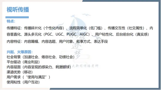 另外,有关短视频的思考角度都可以参考我们在考前点睛系统复习的“视听传播”,答题时完全可以结合我们给出的短视频的特点来答。优势层面可以选取“碎片化”(符合阅读习惯)“低门槛”(成本低)“社交互动性强”“个性化推荐”“渠道移动性强”(接收面广)等,劣势层面也可以选取“碎片化”(不利于品牌深度构建)“低门槛”(质量难以保证)以及“数据导向”(创意被流量压制)等。