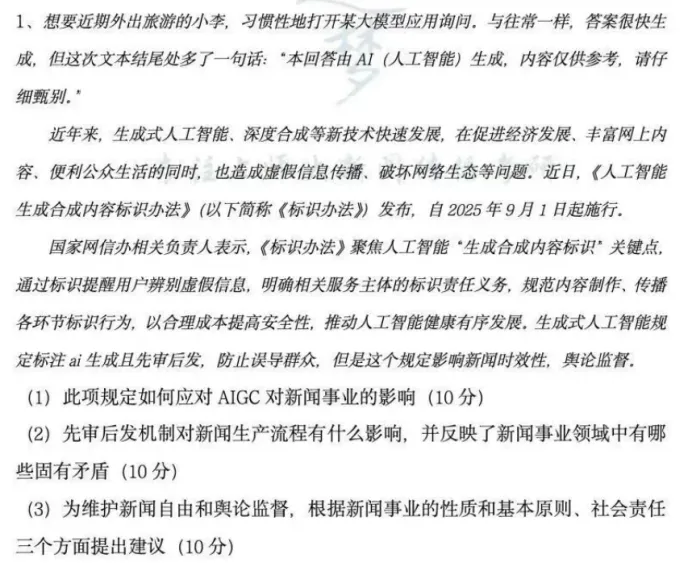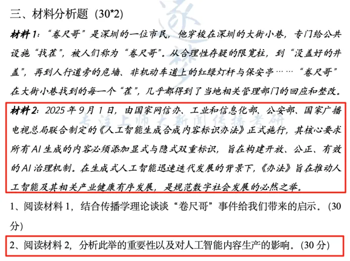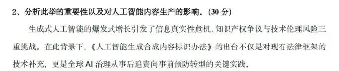 第一问,逐梦岛第三次模拟考完美押中!今年学硕依然考察了AIGC相关内容,逐梦岛对这一块内容无论是平时练题还是押题都是非常重视的。《人工智能生成合成内容标识办法》的考察就是基于学姐对老师研究方向的研判所进行的押题。也在学硕第三次模考中进行了考查!“此项规定如何应对AIGC对新闻事业的影响”就直接参考三模卷里的“此项规定的重要性”。在论述中先回答AIGC对新闻事业的影响,再回答如何应对,而前者在平时练题中已经练习过非常多次了,在点睛班中也有非常全面的复习梳理!
