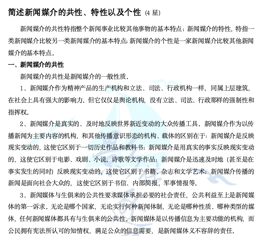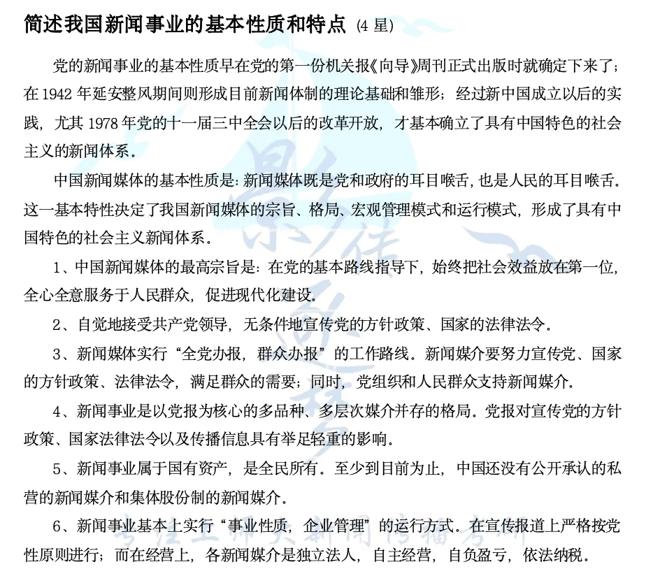 第三问,逐梦岛考点笔记新传册直接押中!“新闻事业的性质、基本原则和社会责任”也是非常基础的内容,直接在《新闻学概论》第八章“新闻媒介的性质”当中的“简述新闻媒介的共性、特性以及个性”和“简述我国新闻事业的基本性质和特点”两道题当中就可以直接得出答案!