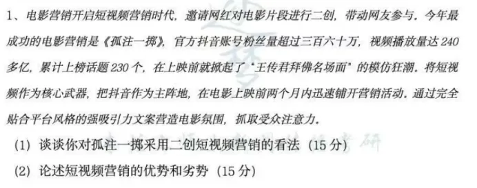 第一问逐梦岛专题笔记广告册直接押中!第一问的题眼是“二创短视频营销”,看似玄乎其玄的,不就是“受众用短视频二创,受众满足了社交需求,同时引发电影的病毒式宣传嘛?”,那我们就可以从“社会化媒体营销”和“病毒式营销”的角度切入分析,逐梦岛对这两种营销模式都有充分的补充。