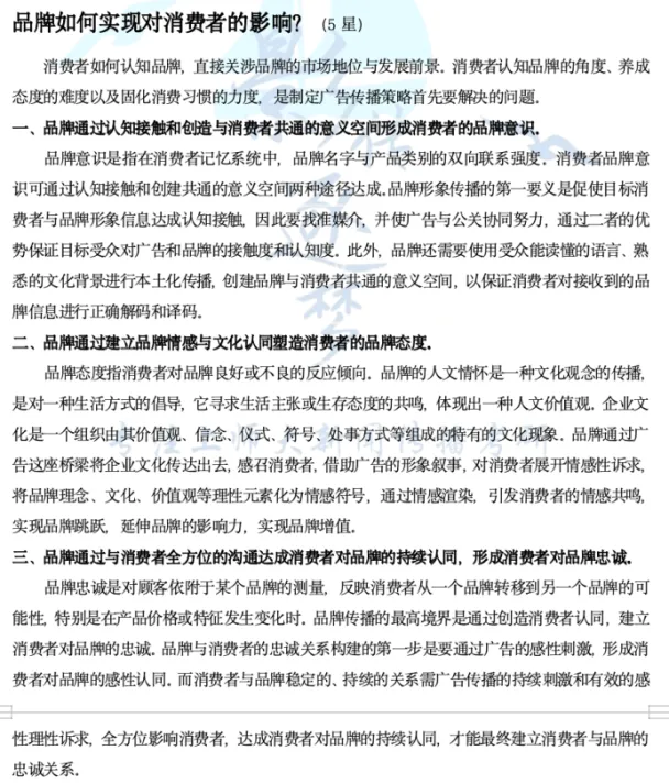 第一问逐梦岛考点笔记广告册和专题笔记广告册共同押中!我们要结合品牌资产理论去分析AIGC在广告中运用的优势,这两块都是逐梦岛所强调的重点。其实在《广告学概论》当中,即便有第四章“广告与品牌传播”,但是对品牌部分的论述是很单薄的,甚至没有对“品牌资产”的充分论述,但是学长基于黄合水教授的《品牌学概论》对这一章内容进行了充分补充。题目还要求从消费者体验角度来论述,所以“品牌资产”所拆分出的“品牌意识、品牌态度、品牌忠诚”也都是重要的论述角度,这些都是书上没有,逐梦岛额外补充的内容。