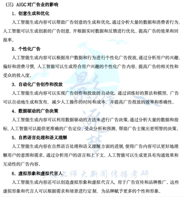 另外,AIGC在广告中运用的优势也在逐梦岛的广告专题笔记中有充分的论述,包括“优化创意生成、个性化推荐,提高语义理解、精准广告投放”等等,答题的所需要用到的各种理论概念都覆盖到了,形成观点展开论述即可。