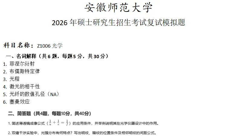 安徽师范大学Z1006光学考研复试真题模拟