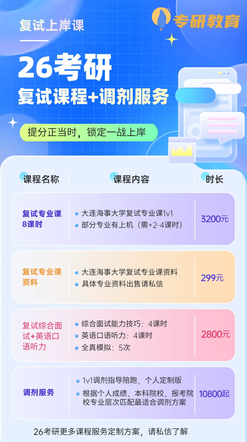 复试专业课面试没有“标准答案”,但有“高分逻辑”!想要吃透所有题型、掌握答题技巧,从容应对导师追问,我们为大家准备了「大连海事大学复试专业课1v1和复试专业课资料」——含高频题答题模板、导师沟通话术、避坑指南等,助力大家精准发力!