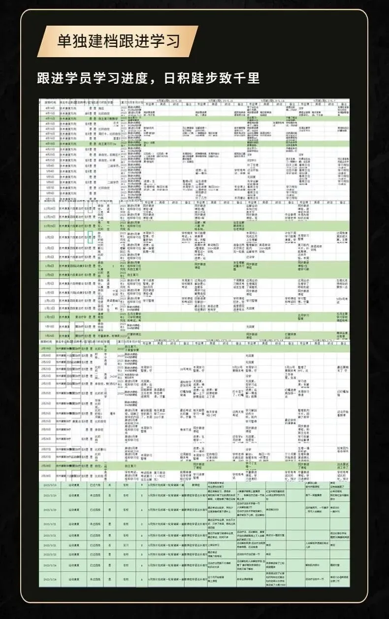 配备一对一督学辅导员老师全程督促学习,并且建立督学档案跟进督学进度,日积跬步可致千里!