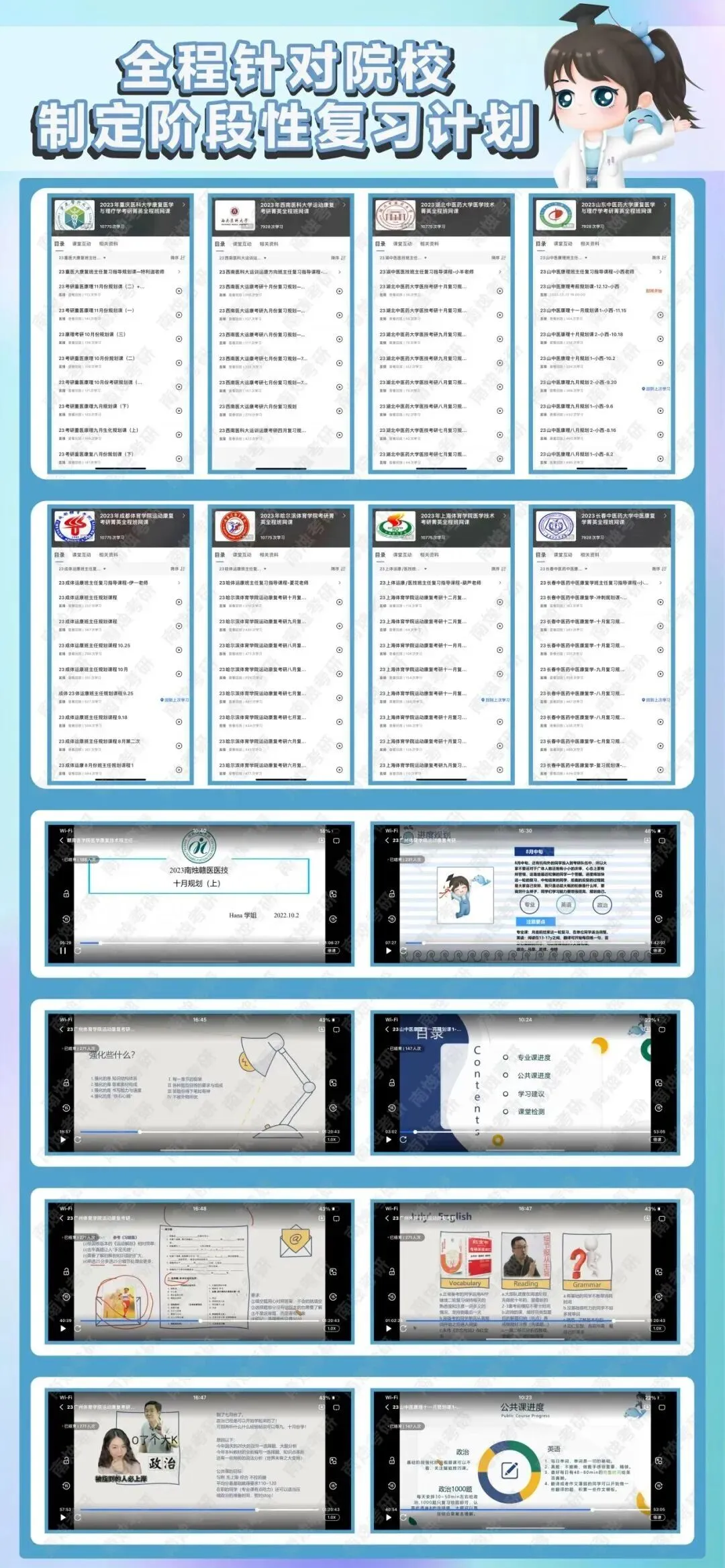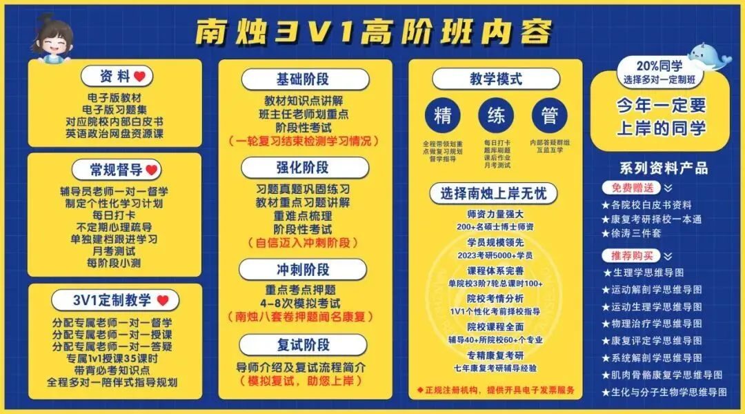 包含初试辅导、复试辅导、调剂辅导以及康复推免辅导等,提供康复考研一站式解决方案 。