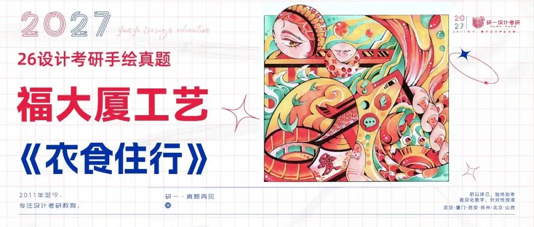 研一老师示范的福州大学26设计考研905设计基础真题《衣食住行》,是以“传统地域文化与现代科技融合”为脉络,串联福建特色生活印记与现代科技成果,构建“时空对话”内核。不仅视觉化呈现四大生活维度,更传递“传承不泥古,科技守本源”的理念,既彰显福建多元文化特质,又体现地域与时代同步的发展态势。