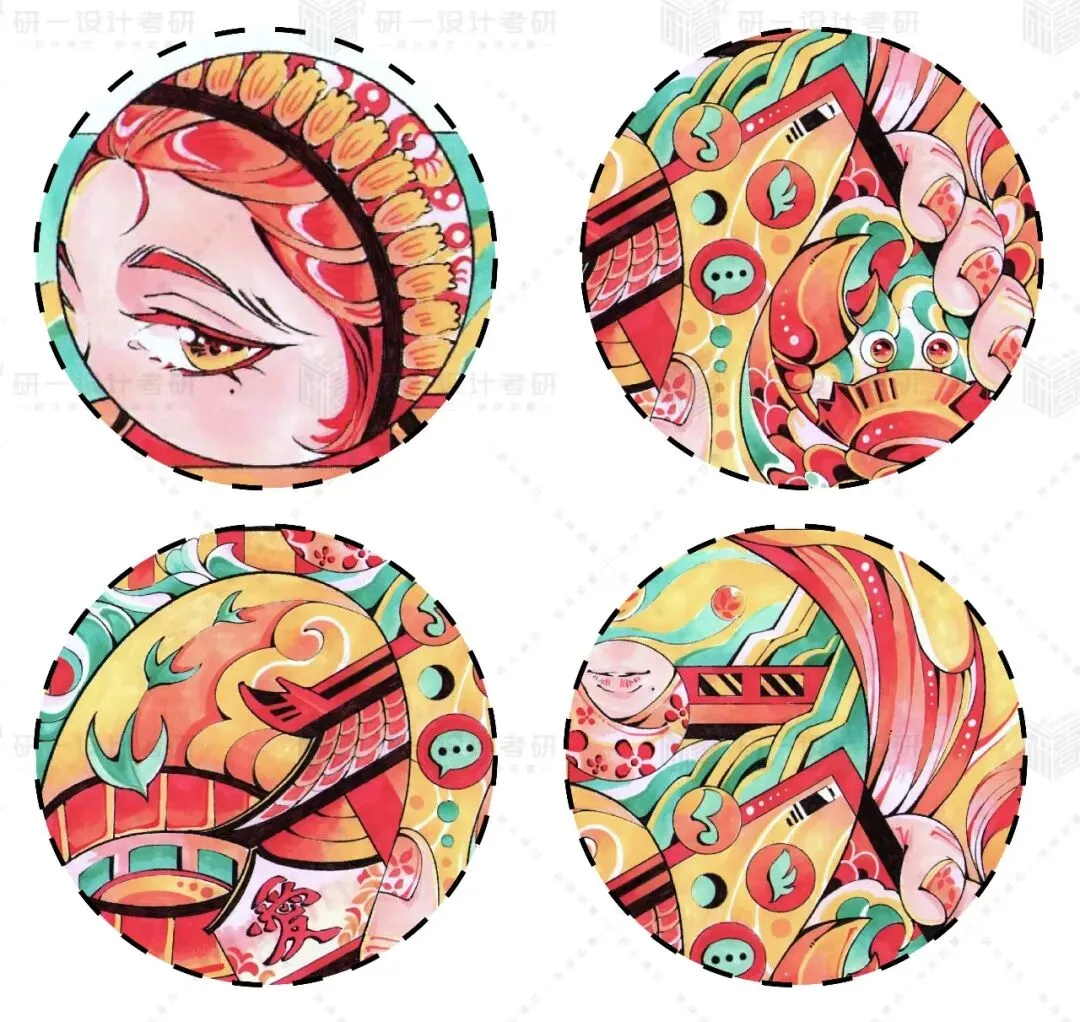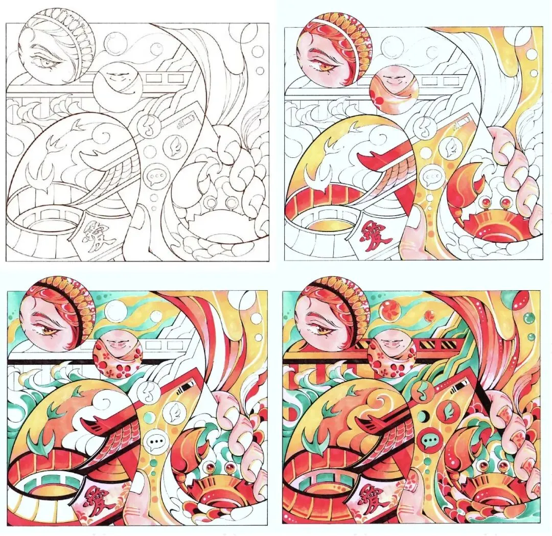 2.“食”穿插鱼、蟹等海洋生物,贴合福建海洋饮食文化,以灵动形态丰富画面动感,与规整元素形成形态对比,增强层次感。