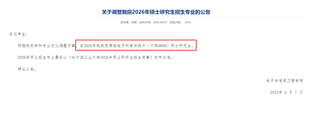 电子与信息工程学院:自2026年起停招电子科学与技术(代码0809)硕士研究生。