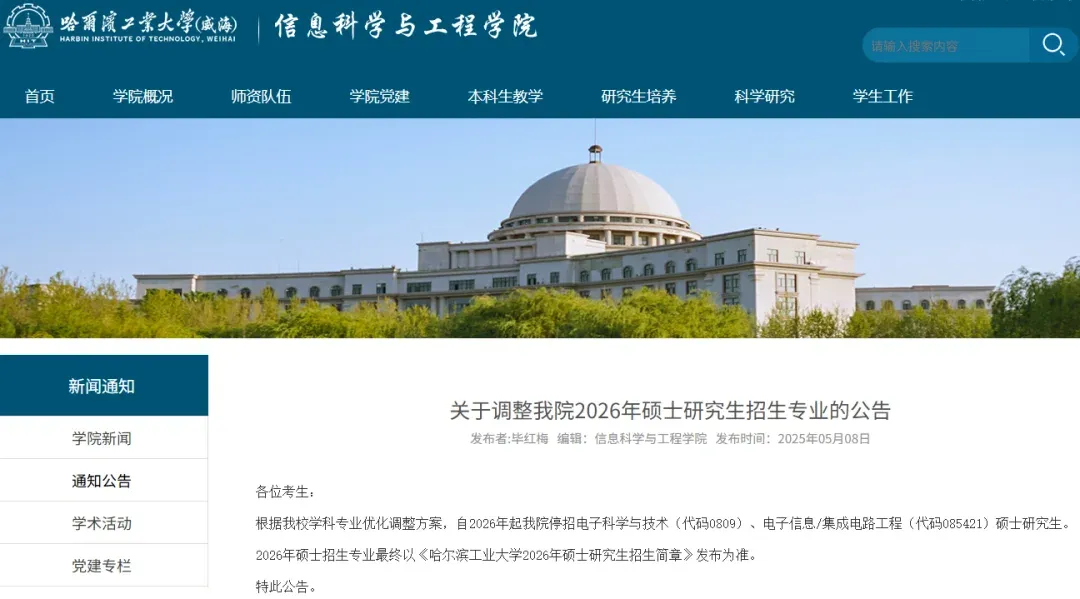 信息科学与工程学院自2026年起,停招电子科学与技术(代码0809)、电子信息/集成电路工程(代码085421)硕士研究生。