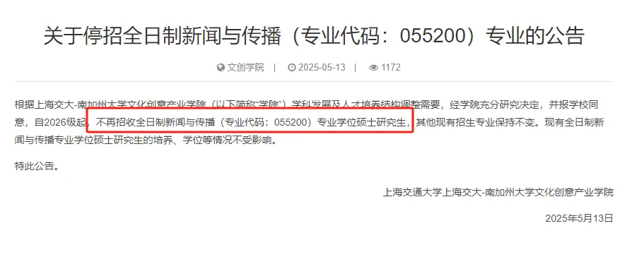 自2026级起,不再招收全日制新闻与传播(专业代码:055200)专业学位硕士研究生,其他现有招生专业保持不变。