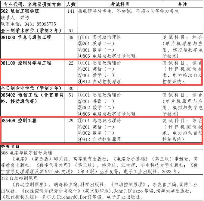 吉林大学控制招生人数不算多,差不多在40人左右。24年学硕复试线为351,录取23人,专硕复试线为353分,录取21人;25年控制学硕复试线:339,与24年相比,下降12分,录取20人!控制专硕复试线:368,与24年相比,上涨15分,录取19人!通信工程学院各专业合格生源充足,不接收调剂。