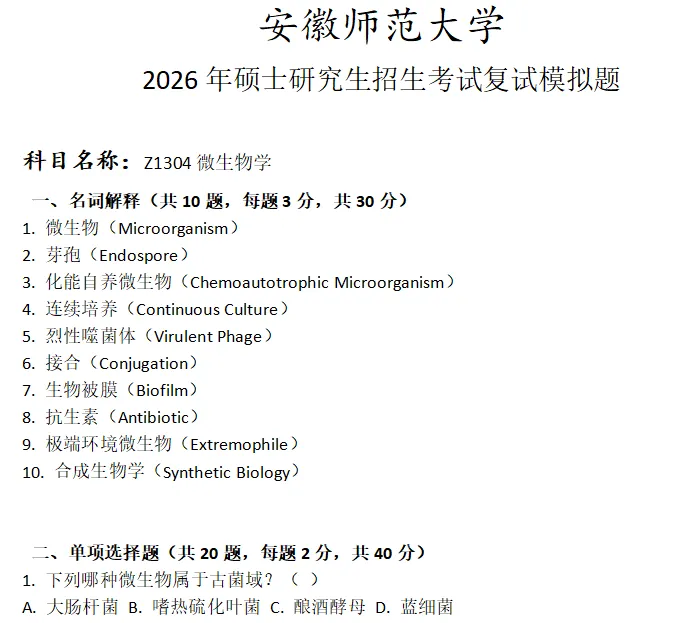 >安徽师范大学Z1304微生物学考研复试真题模拟