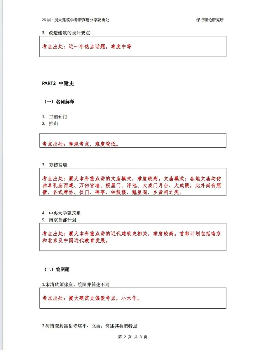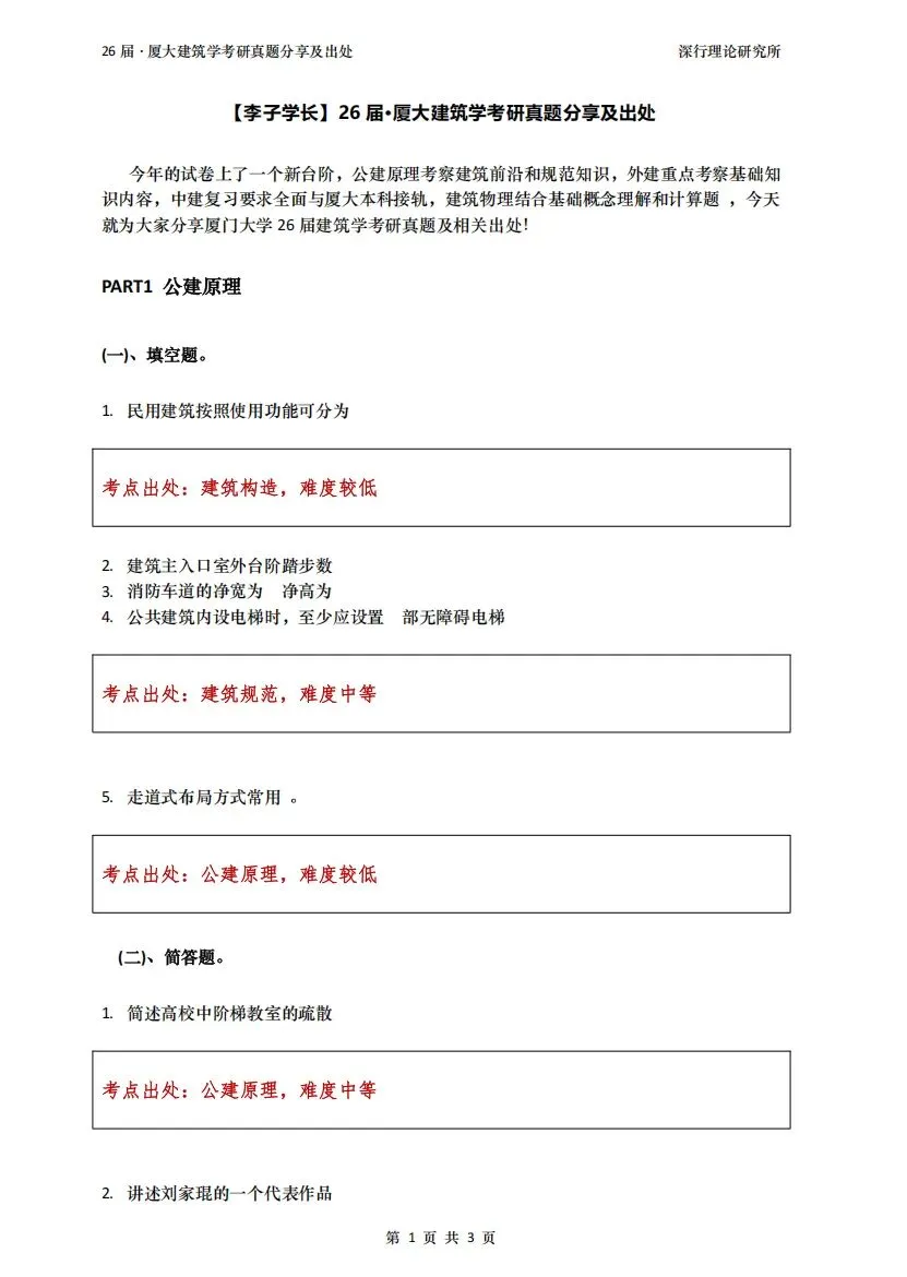 今年的试卷上了一个新台阶,公建原理考察建筑前沿和规范知识,外建重点考察基础知识内容,中建复习要求全面,与厦大本科教学接轨,建筑物理结合基础概念理解和计算题 。 聚焦到考试上,厦大建筑理论的考试开始关注思辨性和基础性,改变以往通过突击、背书、找答案等方式进行,重基础重广度。