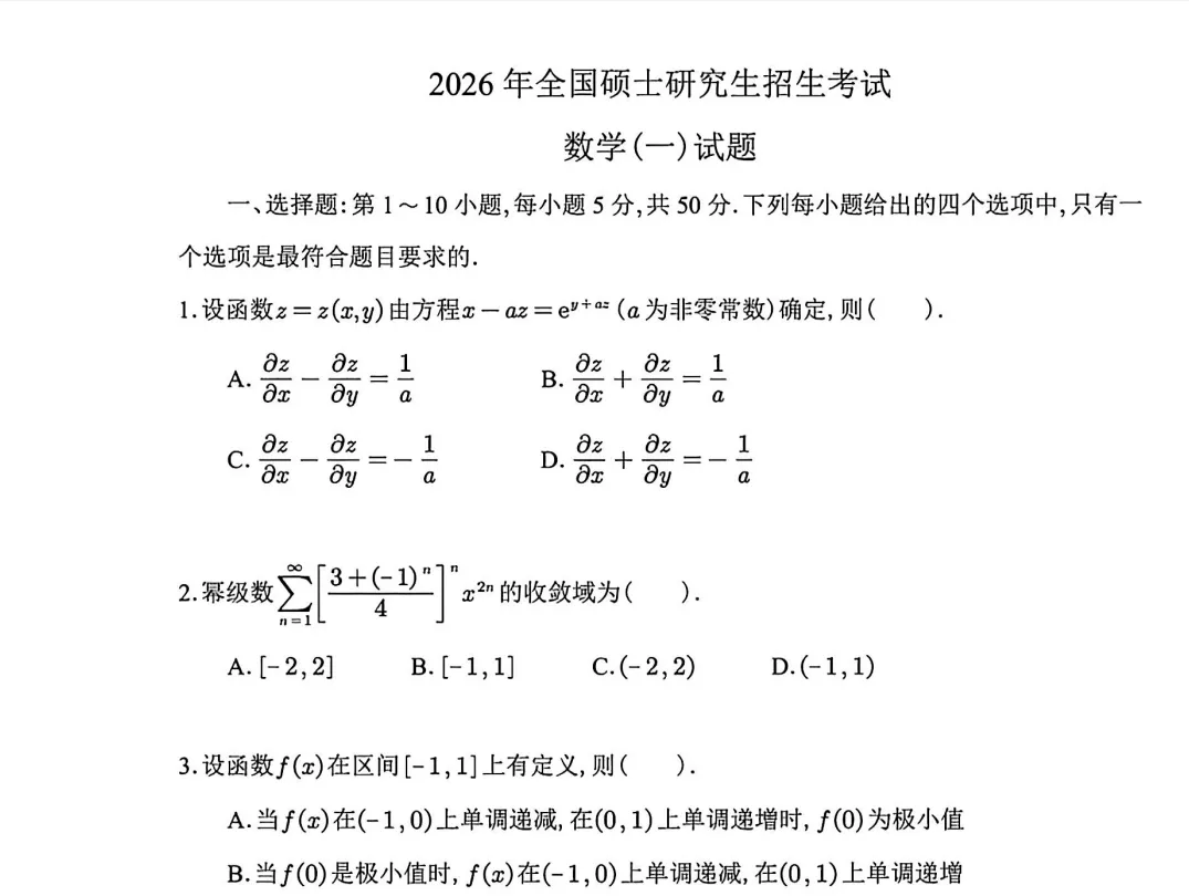 历年考研【数一】真题试卷+参考答案免费下载【含最新2026年】