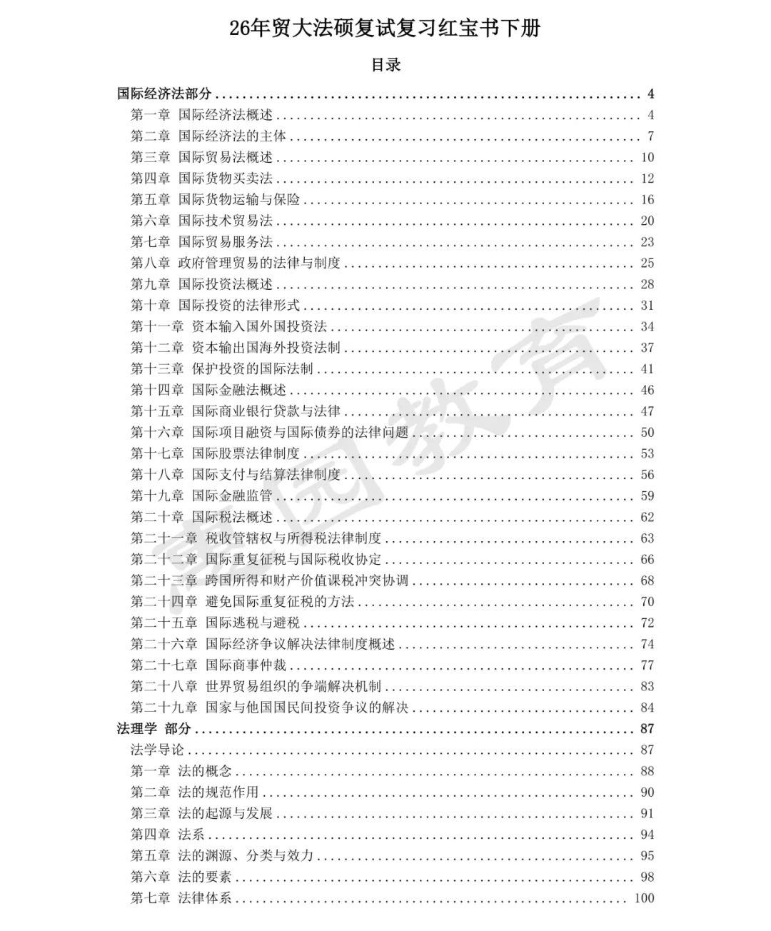 下册内容包括:国际经济法、法理学、宪法、国际公法、民法典新增、民法、刑法、法律英语、公司法修订、民事诉讼法修订,以及贸大复试知识点重点整理和热点等。