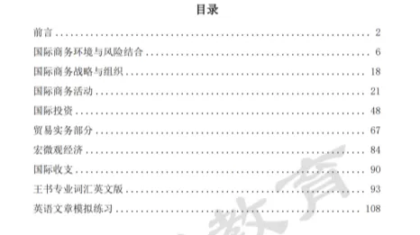 1.国际商务环境与风险结合2.国际商务战略与组织3.国际商务活动4.国际投资5.贸易实务部分6.宏微观经济7.国际收支8.王书专业词汇英文版9.英语文章模拟题练习