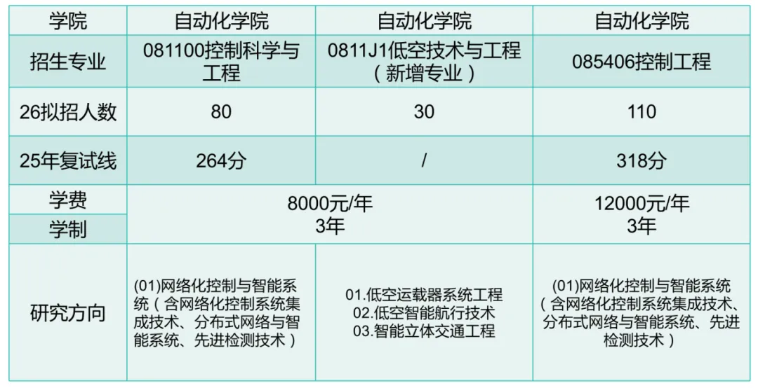 26新增低空技术与工程专业,考数一英一,专业课考810自控原理,招生30人。26控制科学与工程专业扩招2人;专硕招生110人,缩招20人。