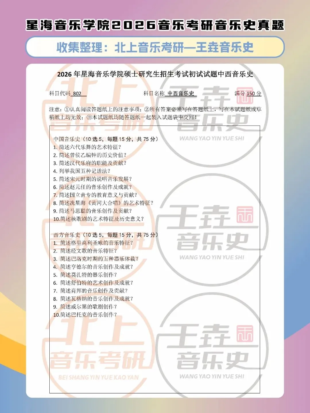 >星海音乐学院音乐史2026音乐考研音乐史真题|北上音乐考研-王垚音乐史工作室收集整理