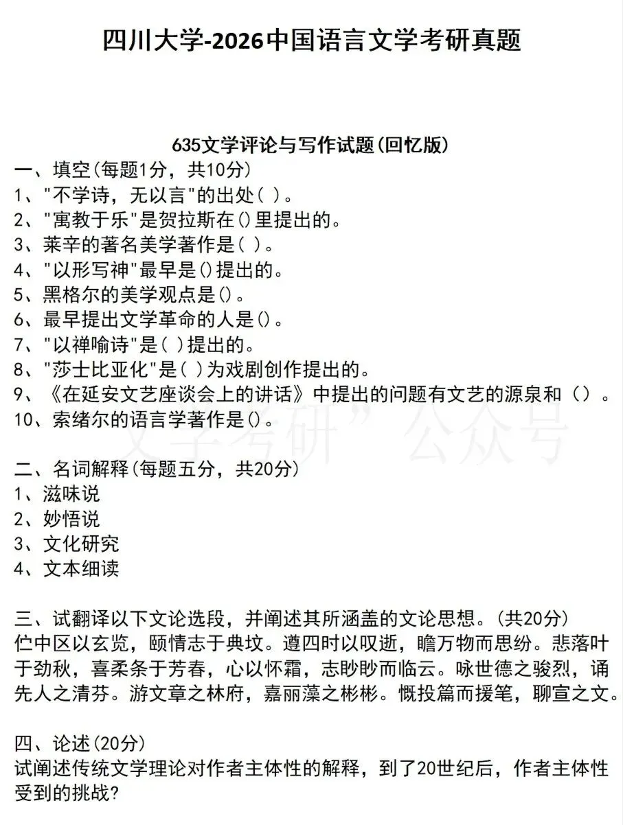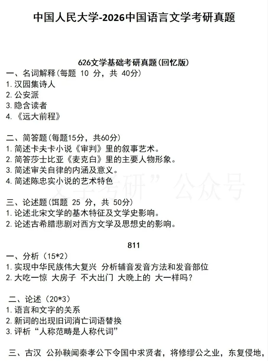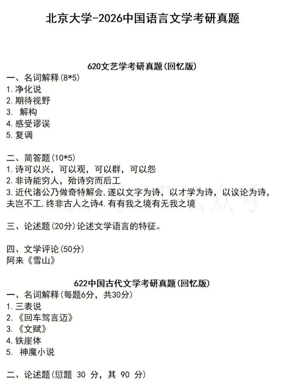 26北京大学文学考研真题(含简要分析)