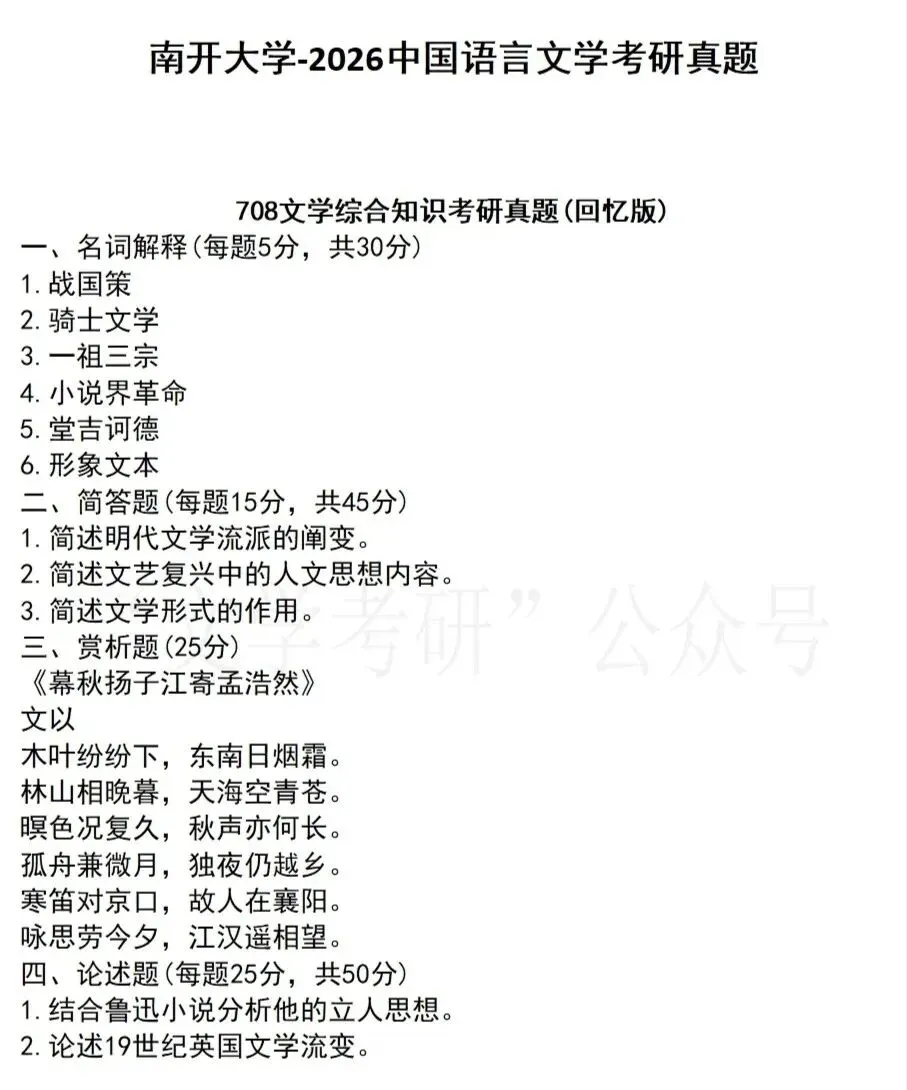 26南开大学文学考研真题(含简要分析)