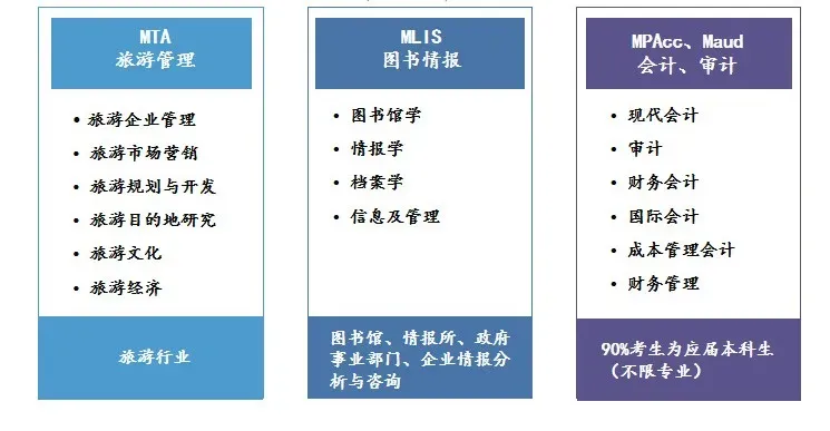 主要包含七个专业学位:MBA工商管理硕士、MPA公共管理硕士、MPACC会计硕士、MEM工程管理硕士、MTA旅游管理硕士、MLIS图书情报硕士、MAud审计硕士。
