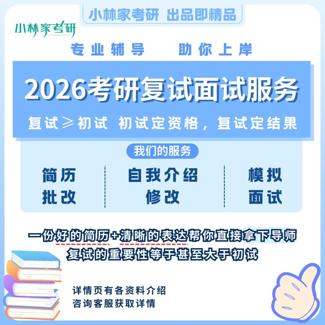 当然,面试中的问题无法被完全预判和穷尽。想要在复试中取得高分,核心还是在于大家的认真准备和扎实积累。备考时间已经不多,愿我们都能全力以赴,成功上岸💪!学子们看过来,今年小林家考研上新了2026年考研复试面试服务。主要包涵复试简历的批改、复试自我介绍内容升华以及模拟面试服务。有需要的学子们可以多多关注,及时联系小林家考研的工作人员。小林家考研将不遗余力助力学子们成功上岸,一路生花~