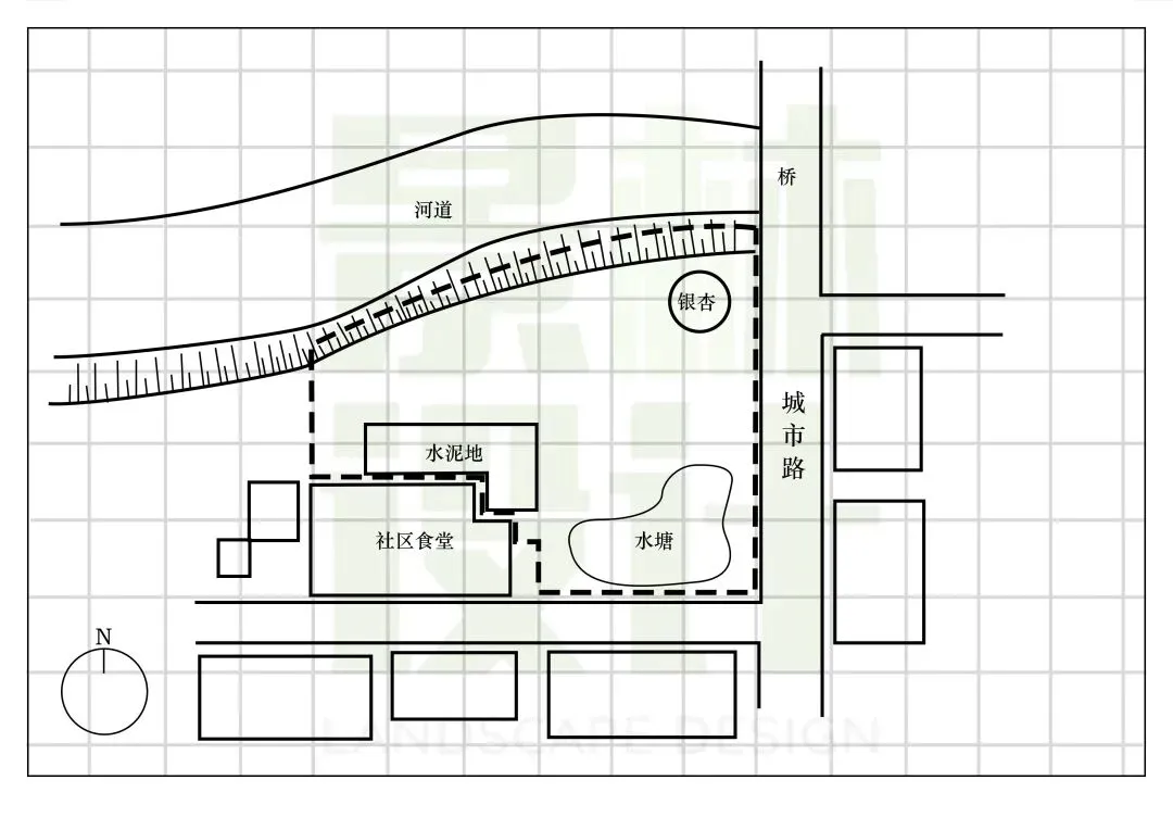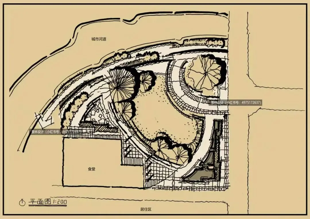 场地虽小,但需处理的要素不少:原有保留树(银杏)、水塘、滨水空间等,学长在画范图的时候以银杏为设计重点展开,使其成为联系了滨水带状空间和社区食堂的重要锚点。